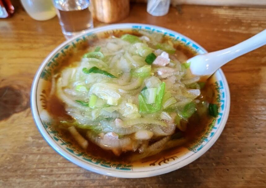 豚そば(安喜亭本店)は、濃厚な豚骨スープに特製の麺が絡む一杯で、ガツンとした味わいが特徴です。トッピングにはたっぷりのチャーシューやネギが乗り、食べ応え満点の一品です。地元住民から観光客まで幅広い支持を集めており、リピーターが多い人気店です。